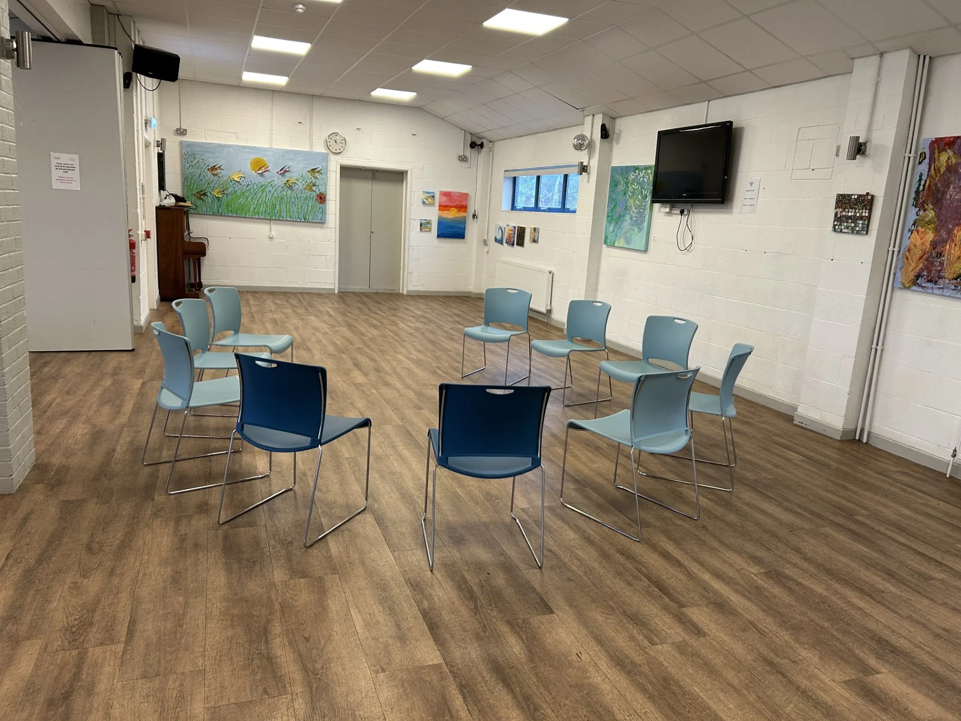 The hall has electric power sockets, a large wall mounted TV with a socket for laptop’s for presentations. There is also a wall mounted screen for use with a projector.
